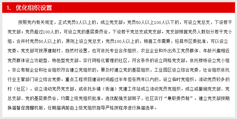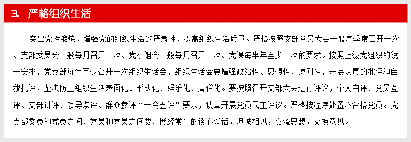 深入贯彻落实党的十八届六中全会精神和全国、全省组织部长会议精神、全市组织工作会议精神,坚持把党支部建设作为最重要的基本建设,着眼常态长效,围绕支部建设标准化、组织生活正常化、管理服务精细化、工作制度体系化、阵地建设规范化“五化”要求,突出问题导向,努力创新创优,注重实际实效,进一步优化基层组织设置、严格组织生活、强化服务功能、完善工作制度、规范阵地建设。着力发挥党支部的主体作用,努力使每个党支部都达到“十有”标准,即有健全合理的组织结构,有凝心聚力的支部班子,有充满活力的党员队伍,有功能完善的活动阵地,有严密完备的管理制度,有务实管用的活动载体,有齐全清晰的工作台账,有详细具体的活动记录,有规范完整的党建档案,有及时更新的党务公开...【阅读详细】