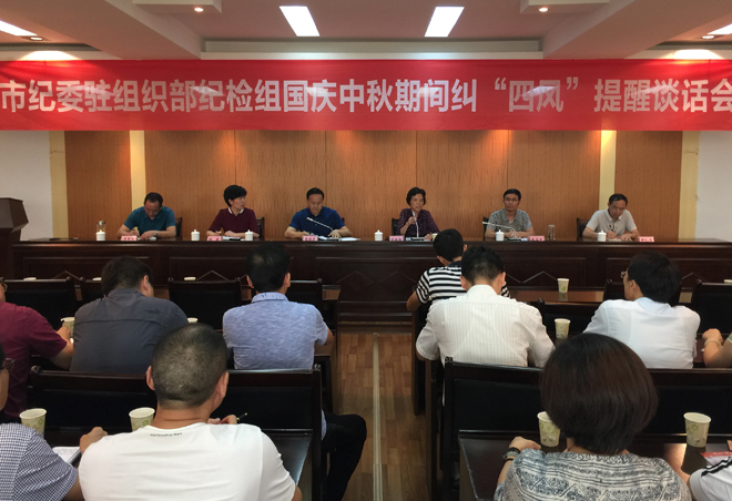 9月26日下午,市委4号楼8楼会议室座无虚席,市纪委驻市委组织部纪检组在中秋、国庆两节前,对市委组织部、市委党校、市委老干部局、市委编办、市科协5家综合监督单位的所有中层骨干进行国庆、中秋纠“四风”集体提醒谈话,共50多人参加了谈话会。