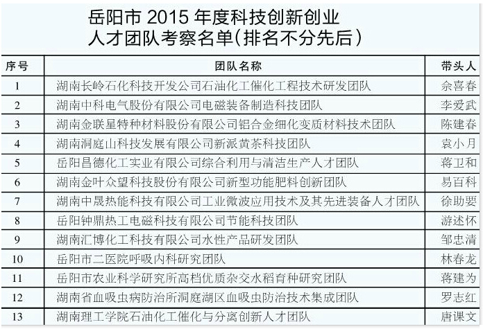 近日,记者从市科技创新创业人才团队评审工作领导小组获悉,经形式审查、专家评审、评审工作领导小组研究等程序,市科技创新创业人才团队支持计划考察对象名单已正式揭晓,长岭科技开发有限公司石油化工催化工程技术研发团队、湖南洞庭山科技发展有限公司新派黄茶科技团队、岳阳市二医院呼吸内科研究团队等13支优秀人才团队进入考察对象名单。