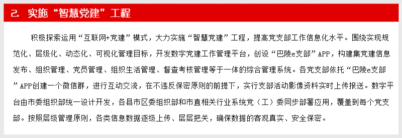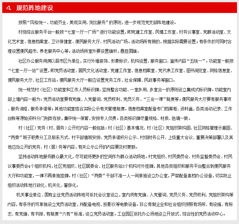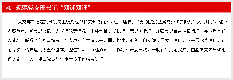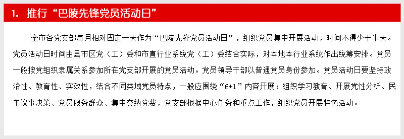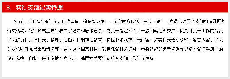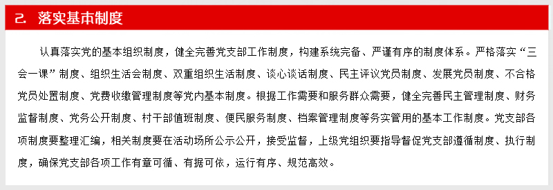 深入贯彻落实党的十八届六中全会精神和全国、全省组织部长会议精神、全市组织工作会议精神,坚持把党支部建设作为最重要的基本建设,着眼常态长效,围绕支部建设标准化、组织生活正常化、管理服务精细化、工作制度体系化、阵地建设规范化“五化”要求,突出问题导向,努力创新创优,注重实际实效,进一步优化基层组织设置、严格组织生活、强化服务功能、完善工作制度、规范阵地建设。着力发挥党支部的主体作用,努力使每个党支部都达到“十有”标准,即有健全合理的组织结构,有凝心聚力的支部班子,有充满活力的党员队伍,有功能完善的活动阵地,有严密完备的管理制度,有务实管用的活动载体,有齐全清晰的工作台账,有详细具体的活动记录,有规范完整的党建档案,有及时更新的党务公开...【阅读详细】