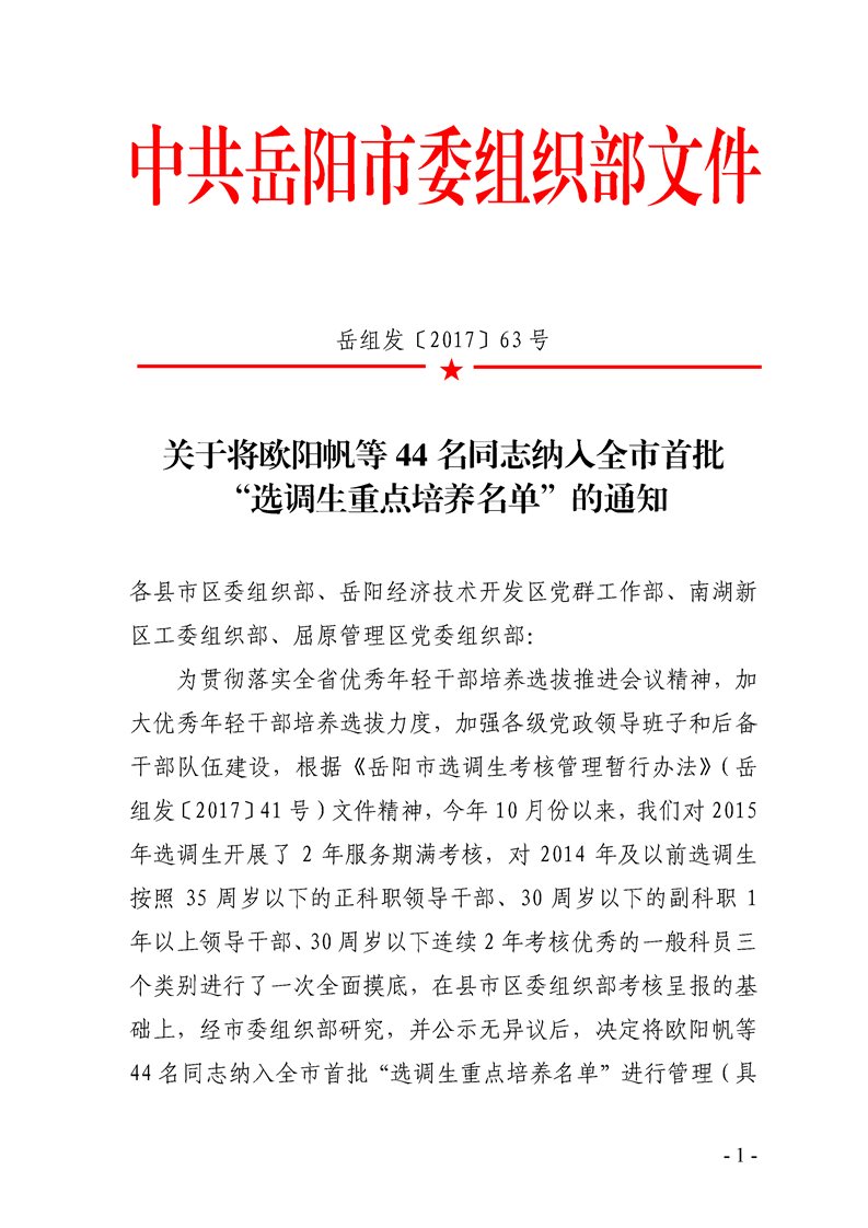 关于将欧阳帆等44名同志纳入全市首批“选调生重点培养名单”的通知